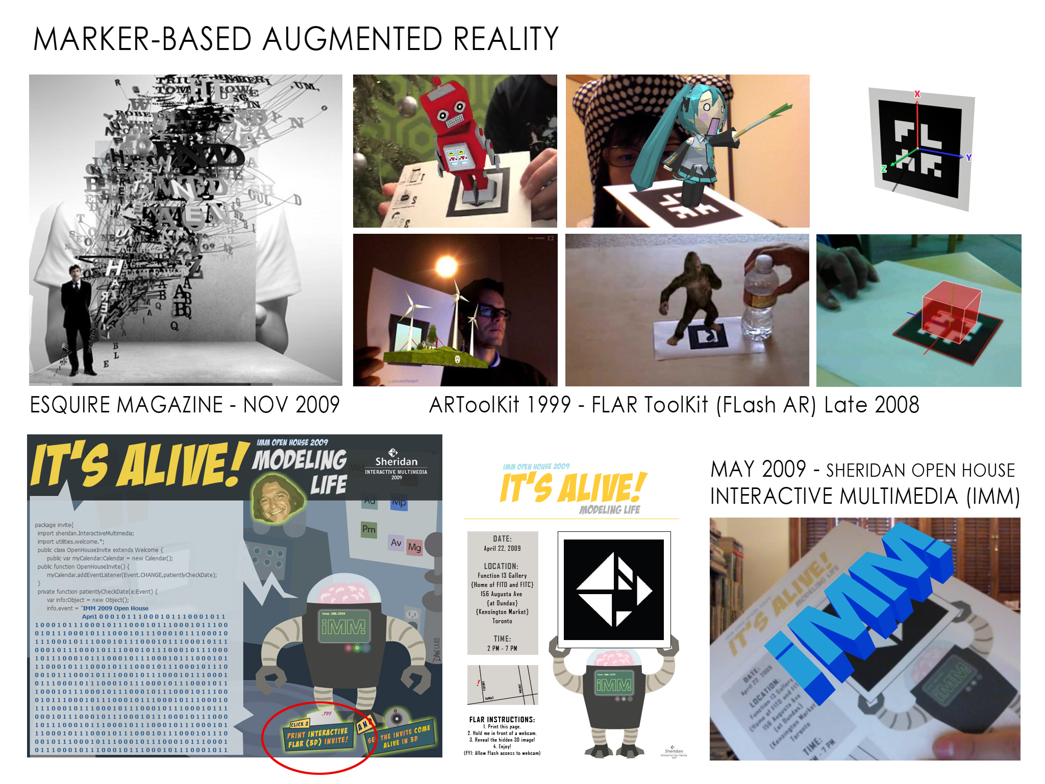 A popular Augmented Reality usage was marker based control of 3D images. This trend may have come and gone but may find a permanent home in gaming, etc. The Sheridan IMM students made 3D IMM logo Flash invites in 2009. We also served virtual sushi on a plate at the open house.